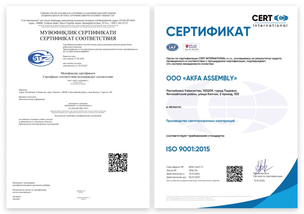 Настоящий сертификат удостоверяет, что система менеджмента качества ООО «AKFA ASSEMBLY» соответствует требованиям международного стандарта ISO 9001:2015.